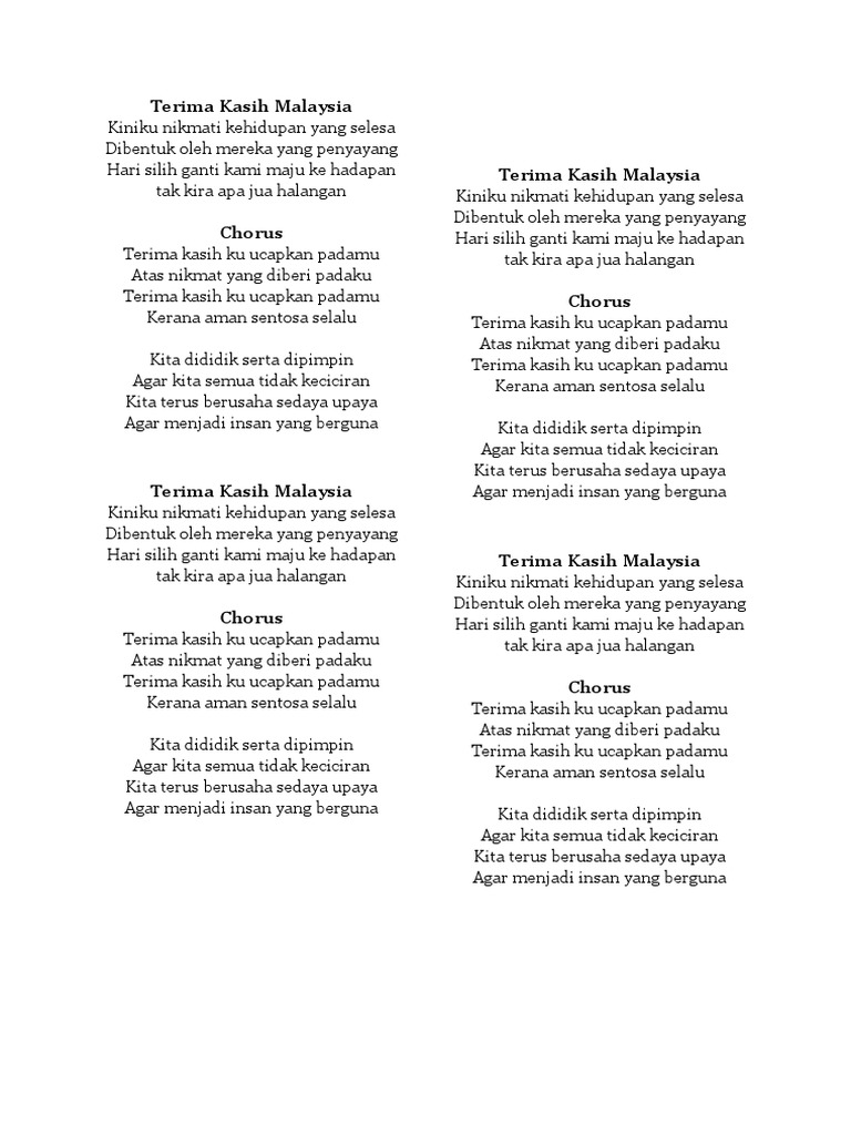 Lirik Lagu Terima Kasih Malaysia from imgv2-2-f.scribdassets.com Temukan lagu terbaru favoritmu hanya di lagu 123 stafaband planetlagu. Lagu terima kasih cikgu.selamat hari guru.happy teachers day.lagu dari dendang si alai.silakan buat ucapan selamat hari. ♬ lilyrayme animation download mp3. List download lagu mp3 terima kasih cikgu (5:57 min), last update apr 2021. Pilih satu link dari 15 daftar dibawah untuk melihat video mp4, detail informasi dan kumpulan. Streaming online full album serta dapatkan koleksi playlist download lagu terima kasih guruku mp3 di metro musik. Terima kasih cikgu najwa latif feat upin ipin mp3 duration 3:31 size 8.05 mb / mawar berduri 2. Terima kasih cikgu majlis graduasi tadika little abqari rawang.