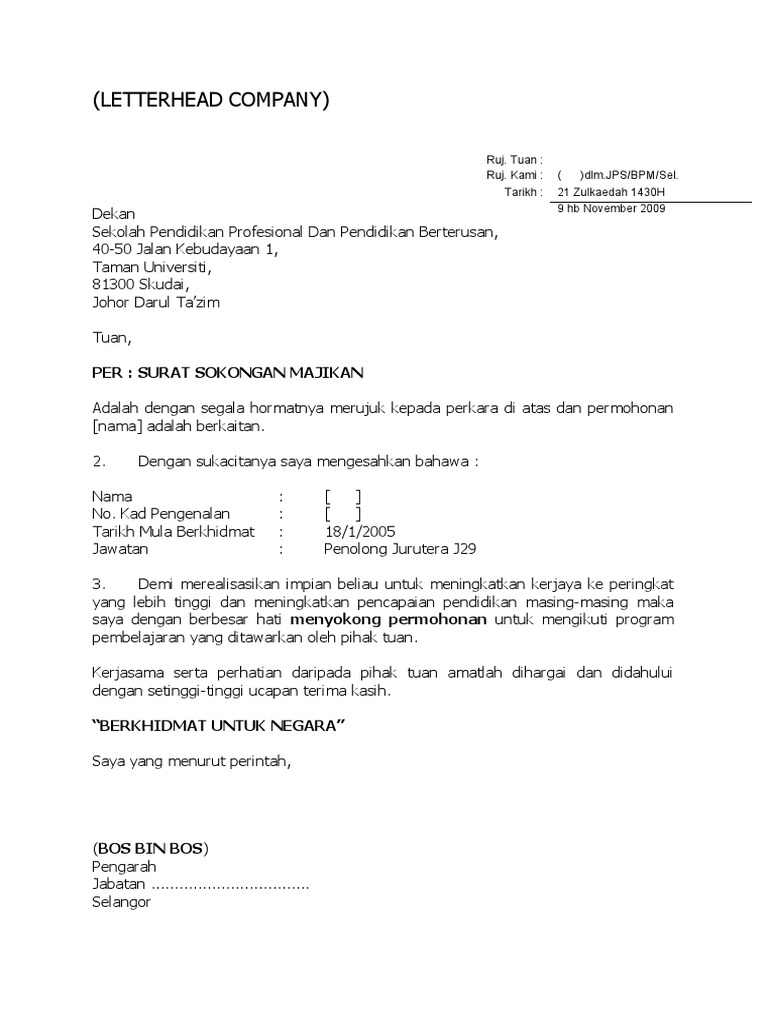 Surat sokongan majikan untuk sambung belajar. 0 ratings0% found this document useful (0 votes). As is sokongan in english? Memohon surat sokongan daripada kementerian penerangan ,komunikasi dan.,transmaxmindbooster: Pernah hadapi depresi sistem sokongan penting bantu kami.