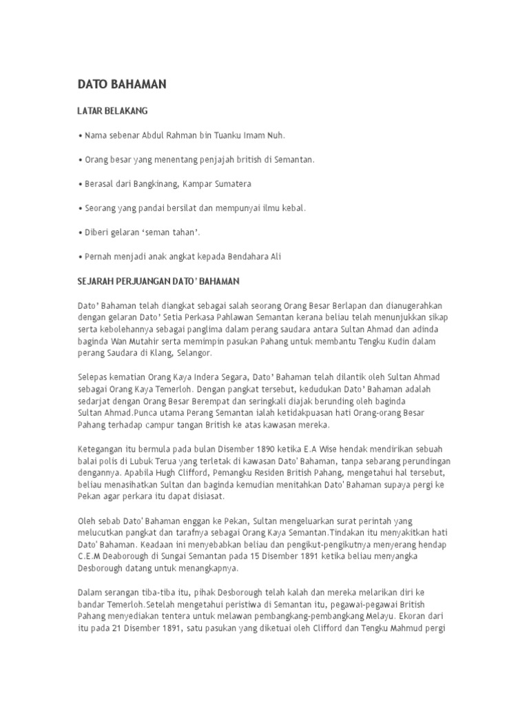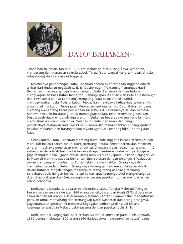 Dalam folio ini mengadungi biodata pahlawan sejarah dato bahaman, latar belakang, sumbangannya, kesan penjuangan, factor peperangan, dan gambarnya. Karangan kemajuan teknologi dalam pembangunan negara karangan ciri ciri usahawan berjaya tahun 5 karangan cara cara menjaga kesihatan diri tahun 5 karangan cinta akan negara karangan cara cara menjaga alam sekitar karangan hak asasi manusia karangan kempen kesedaran alam sekitar karangan ciri ciri pekerja. Pada november 1874 perak menerima residen british iaitu j.w.w.birch hasil daripada perjanjian pangkor. Sejarah dato bahaman pahlawan pahang pengarang: Beliau mahir dalam seni pertahankan diri sehingga diberi gelaran seman tahan kerana dapat menyelesaikan masalah secara fizikal dan intelektual. Dato' bahaman was an orang besar raja in pahang. Beliau merupakan seorang orang besar raja (seorang lelaki yang mentadbir tanah yang diberikan kepadanya oleh sultan dan salah seorang pembesar di istana) di negeri pahang. Peristiwa penentangan dato' bahaman adalah seperti berikut: Abdul rani bahaman had been appointed as the first director of ibs and prof. Adalah seorang pahlawan terkenal di pahang,malaysia. Dato' bahaman telah diangkat sebagai salah seorang orang besar berlapan dan dianugerahkan dengan gelaran dato' setia perkasa pahlawan semantan kerana beliau telah menunjukkan sikap serta kebolehannya sebagai panglima dalam perang saudara antara sultan ahmad dan adinda baginda wan mutahir serta meminpin pasukan. Walau bagaimanapun, datok bahaman tidak menolak cara diplomasi. Background of dato' bahaman and british presence in pahang noriahsulungwrote about the impressive background and character of dato' bahaman which gained much respect by friends and foes alike.