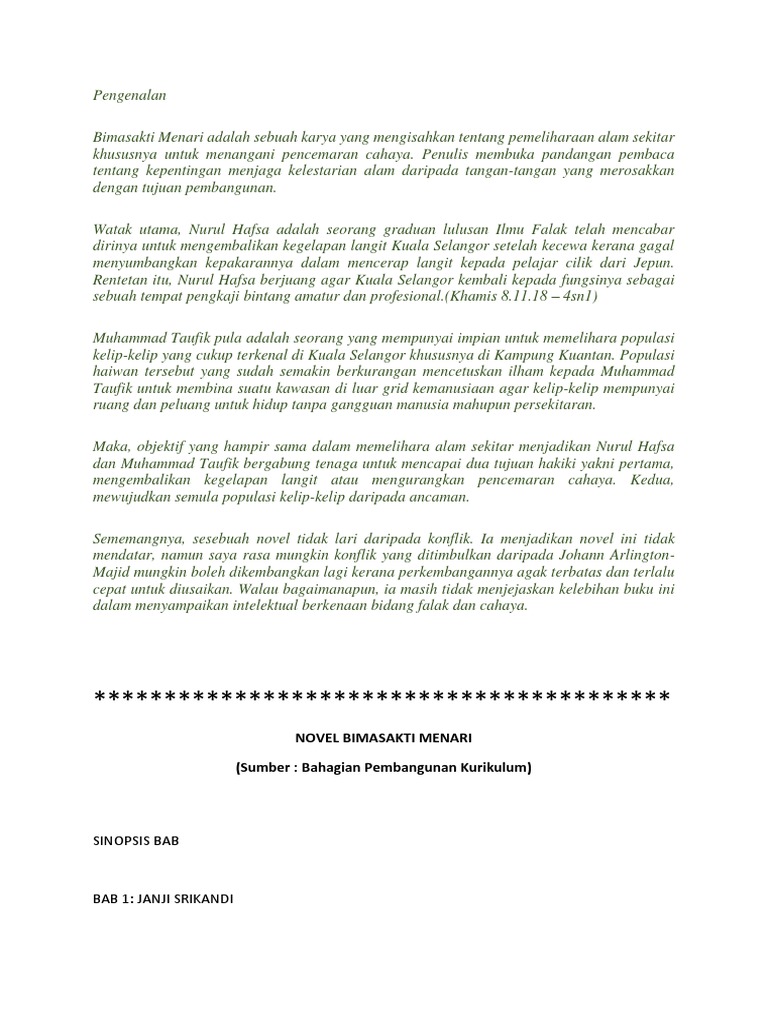 Dia mendapat bantuan abangnya, budiman dan sahabat abangnya. Komponen sastera dan novel bm / bahasa melayu. Berdasarkan novel bima sakti menari karya sri rahayu mohd yusop yang telah saya kaji di tingkatan lima, terdapat beberapa nilai kegigihan yang telah dikemukakan oleh pengarang. Peleraian dalam novel bimasakti menari ialah peristiwa luahan isi hati. Novel komsas tingkatan 5 peristiwa buruk yang menimpa muhammad taufik memiliki hikmah yang tersembunyi.